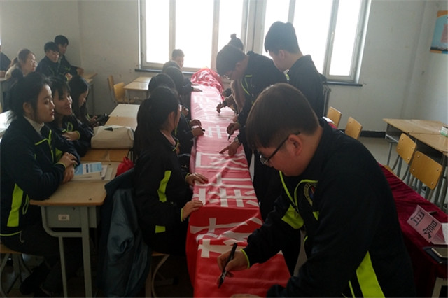 在蔡爽书记带领下,全体团干部在“学雷锋、树新风、争做校园文明使者”条幅上签字明志。