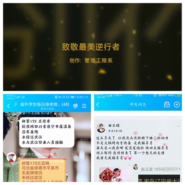 管理工程系辅导员刘娜,贯彻学校每日疫情零报告制度,通过QQ群对其所带班级学生,特别对南方学生加以关注。她每天组织学生上报家庭住址、当天所在位置及身体是否有异常等信息,还通过抖音直播的方式召开题为《抗击疫情 我们在行动》的主题班会,从正确认识和了解疫情、防控疫情的方法、如何合理度过剩余假期及开学前应该做好哪些准备等几个方面,与所带的4个班级学生进行网络“面对面”交流。同时,她还组织本系部分学生代表录制短视频,向奋战在抗疫前线的最美逆行者致敬。