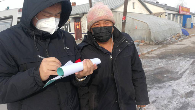 土木191班团员耿闯在哈尔滨市双城区做疫情防控志愿者,主要工作是对来往人员进行信息登记。