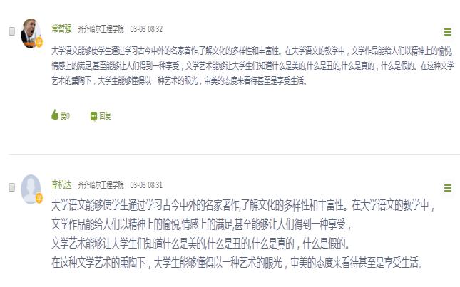 学校线上开课后,基础部语文教师王春凤借助学习通和QQ群平台,本着课程服务于专业培养目标、服务于学生成长的目的,对任教班级进行学情分析,在了解专业和学生特点的基础上,对《大学语文》在线教学流程进行了精心设计,努力营造一种学生乐学的学习氛围。——