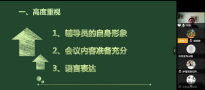 机电系辅导员王虹结合家长会召开情况,就团队重要性、沟通即是教育、做到四个“真”、家长反馈即是工作效果、家校共建即是学生成长进行交流分享,介绍了云家长会的前期准备工作,从团结就是力量、沟通就是教育出发,会上做到真实的教育、真诚的鼓励、真心的关爱、真正的收获,总结认为:此次家长会搭建了学校与社会、教师与家长、学生和家长交流平台,在疫情防控期间让学生和家长的心态、情绪通过会议互动得到沟通、得到辅导,实现家校共建共育。同时,通过家长会也有助于各位辅导员有针对地对到校开学后的工作提前做出准备。