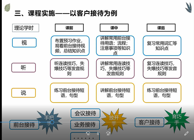 赵丹丹老师的《英语视听说IV》课程分享,其特点是:面向英语专业学生的职业领域,解构和重构课程内容,同时设计相应的学习产出内容;在课程实施方面,从视、听、说三个维度展开教学过程,以赛促学;注重过程性评价,为学生建立成果档案。