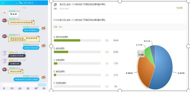(四)讨论身边事,思考为什么。课中设置贴近生活的讨论题,如“成功的景区开发是什么样的”“原住地居民怎么办”,以学习小组为单位进行讨论,促使学生思考并动手查阅相关资料,提高学生的自学能力。小组将讨论情况发到QQ群中,由教师进行点评,对与知识点相关度最高的讨论小组每名同学奖励1分,对学生讨论中未考虑到的知识点,教师再进行详细讲解,如在讲到风景区规划的原则时,组织学生针对失败案例违反了风景区规划的哪一项原则进行投票,让学生边看案例边思考,既巩固了知识点,又带动起学生学习情绪,同时监督了学生在线学习情况。
