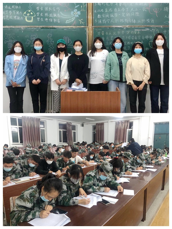 为让学生有更好的书写体验,将提前准备好的书写材料发放到新生手中,由学长通过精美的示范性板书将书写要求展示于黑板。通过实际的练习和临摹,2021级新生基本掌握了财管专业对汉字书写的技巧和要领。