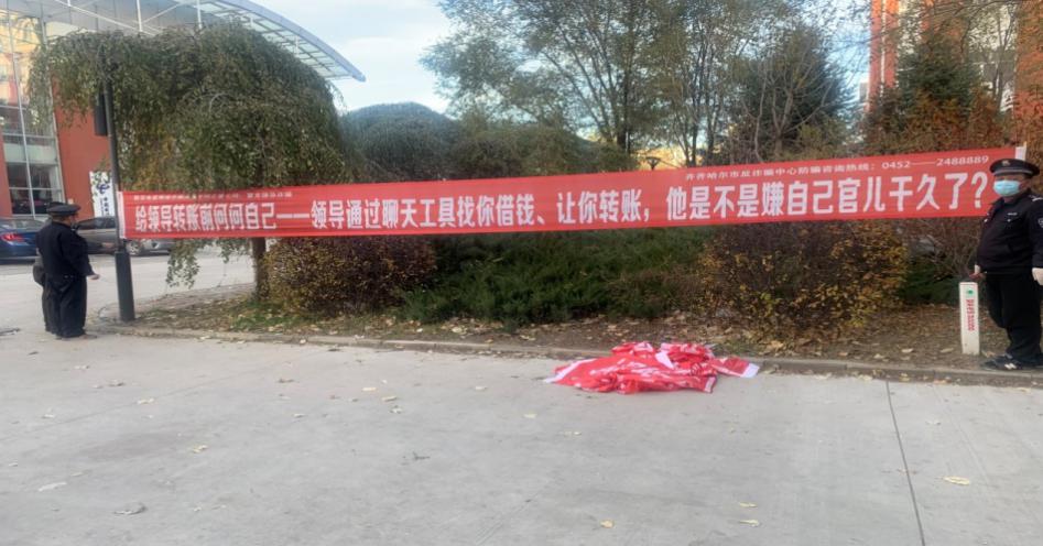 在学校保卫处的积极配合下,高新分局警官齐德才在校园内醒目位置等悬挂了“防范电信网络诈骗”宣传标语,从而起到警钟长鸣的作用。