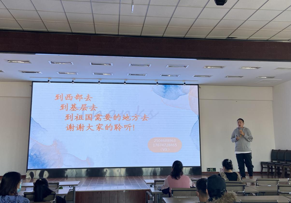 建筑工程系刘子豪老师向学生讲述了志愿服务西部计划的亲身实例,分享了支援西部归来后的心得,并从国家政策、西部环境、地理人文、大学生思想觉悟四个方面进行讲解。刘老师表示,大学生是将个人小梦和国家大梦结合起来的爱国新青年,要肩负责任,到祖国需要的地方去,用实际行动表达爱国之情。刘老师慷慨激昂的讲述引起学生们的共鸣,现场掌声阵阵。