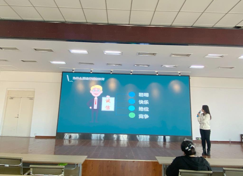 建筑工程系宋雪微老师通过视频播放的方式,为学生们讲述了为什么要进行诚信教育,她表示,诚信不仅是一种品行,更是一种责任;不仅是一种道义,更是一种准则;不仅是一种声誉,更是一种高尚品质的体现。希望同学们树立良好的品质,在生活中坚持“诚信为本”,养成讲诚信的好习惯。