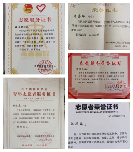 在担任志愿者期间,有的学生坚守24小时站岗值班;有的学生身处入户排查第一线;有的学生不畏严寒协助社区悬挂宣传条幅;有的学生加班加点忙碌,确保防疫物资发放到位。冰雪严寒中,这些学生志愿者们披星戴月默默无闻地坚守在各自岗位上,任劳任怨地做好疫情防控工作。他们冲锋在前、无私奉献,协助家乡政府共同抗击疫情,践行了新时代新青年的担当和使命,成为冬日里最动人的风景,受到所在地各级政府的表彰,同时,各级政府也对学校培养出如此优秀的学子表达了敬意。