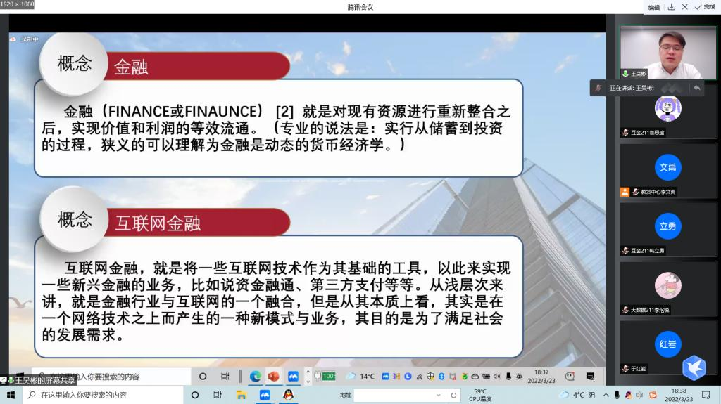 3月24日晚, 第二期易湖金融科技论坛在云端开讲,本期论坛特邀南京理工大学工商管理硕士王吴彬主讲,伟德官网管理工程系互联网金融专业、信息工程系数据科学与大数据专业的师生100余人线上参会。专业长李文禹主持。