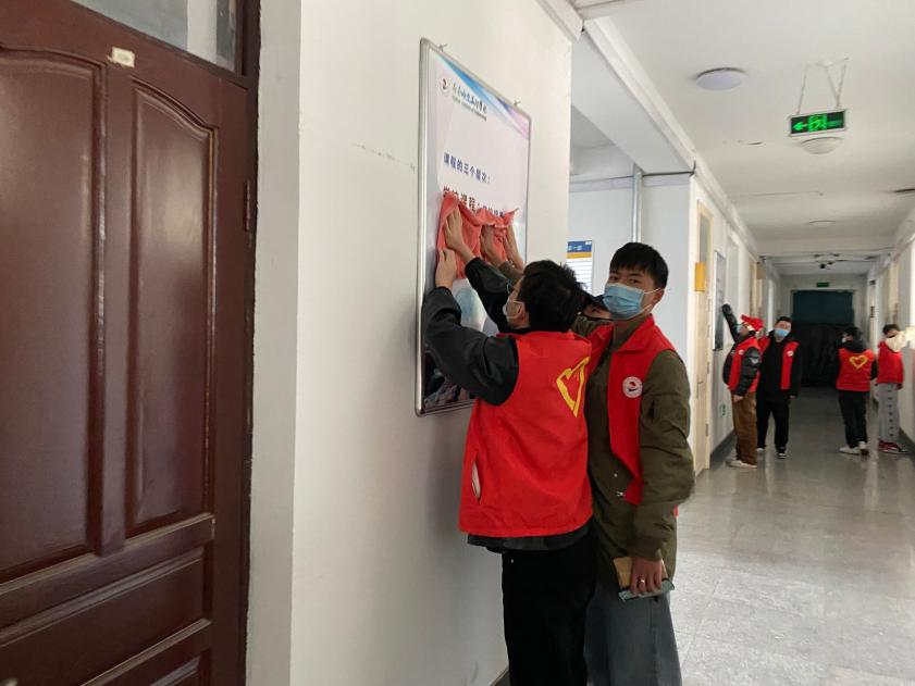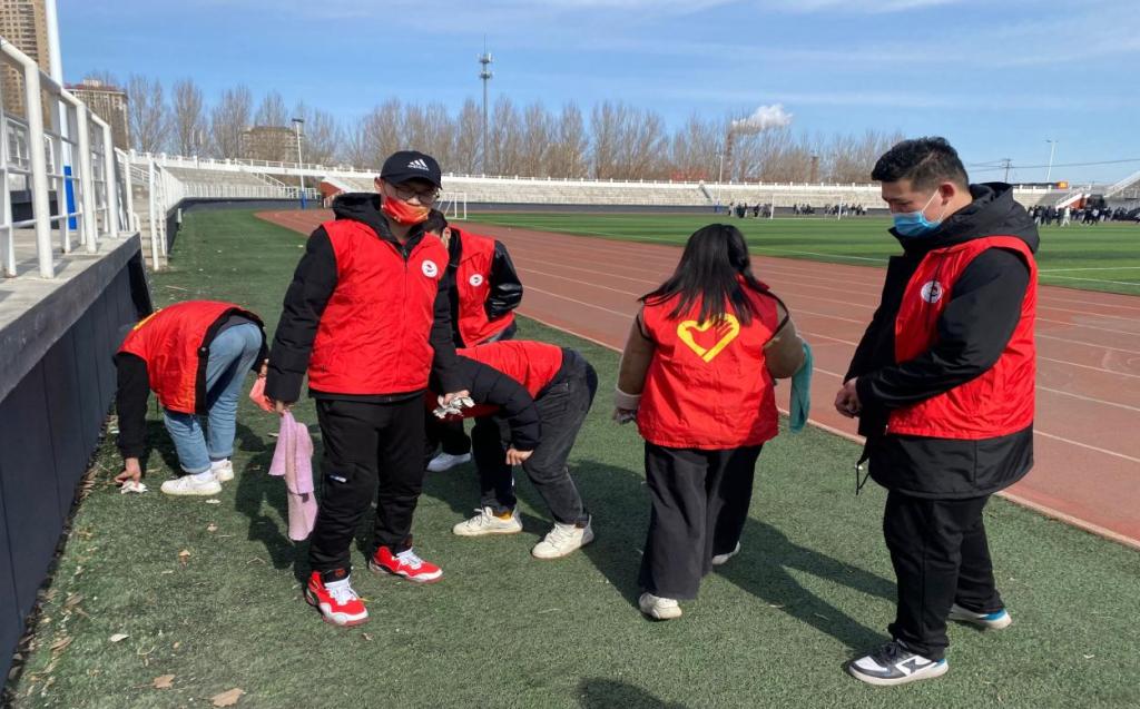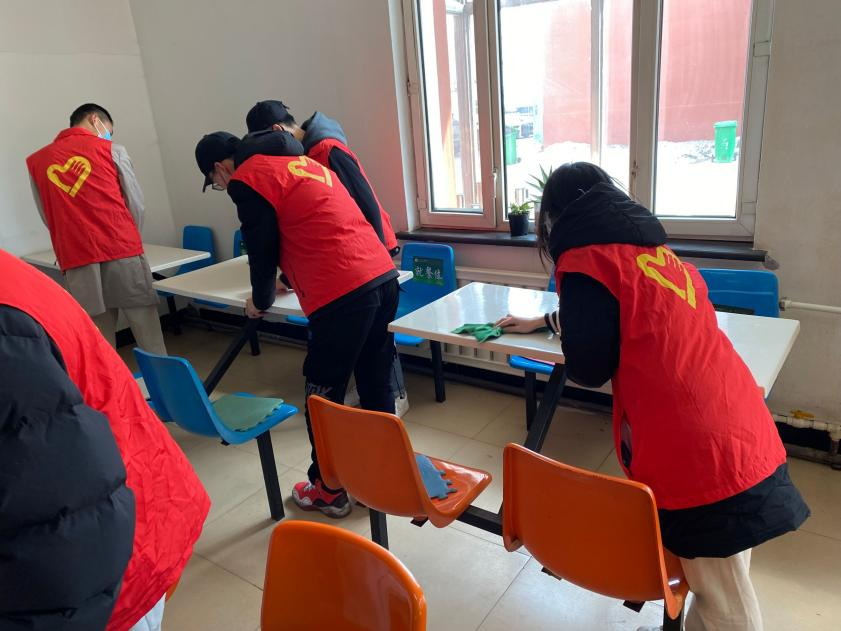 北方的三月,天气仍然寒冷,冰雪未化,短暂的回暖后又迎来了一场纷纷扬扬的飘雪,50位青年志愿者不畏严寒,穿着红色马甲,分工分组,拿着扫帚、抹布、拖把等工具,对学校各教学楼的校园文化牌、食堂餐桌椅等进行了全面彻底的擦拭,对大学生活动中心的库房、走廊,以及体育场的垃圾进行了清理。