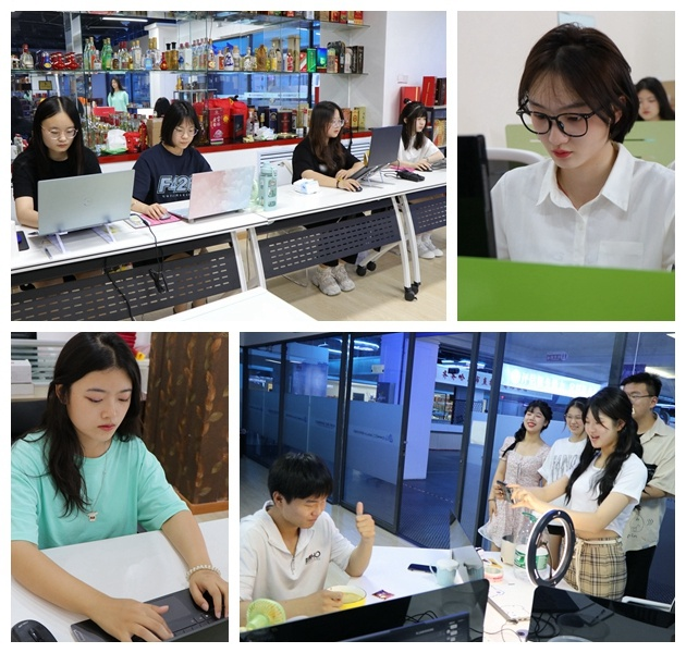 下一站,笔者去了百花电子城。在这里实习的管理工程系电商202班梁嘉玲同学把笔者带到她实习的工作场所。笔者所见,环境优雅,同学们各个都是“白领”的模样,或在电脑前策划文案,或学习带货,或录制视频,制作宣传品,各司其职,工作有序。