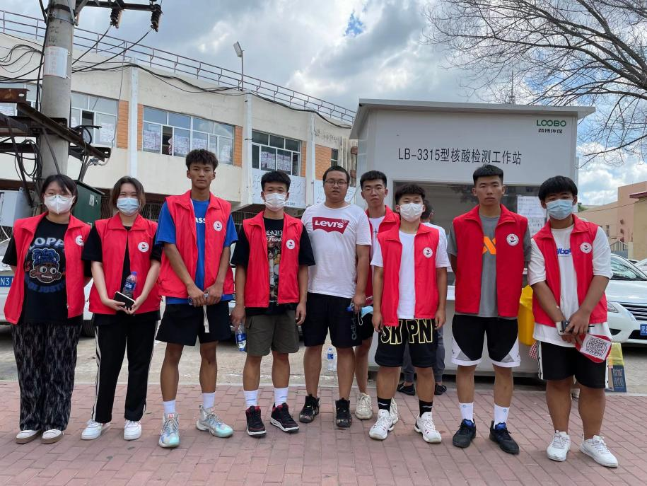 7月22日8点半,机电系团总支书记于海龙带领机电工程系八名学生志愿者在鹤城体育场核酸检测点协助龙沙区五龙街道红星社区进行核酸检测。