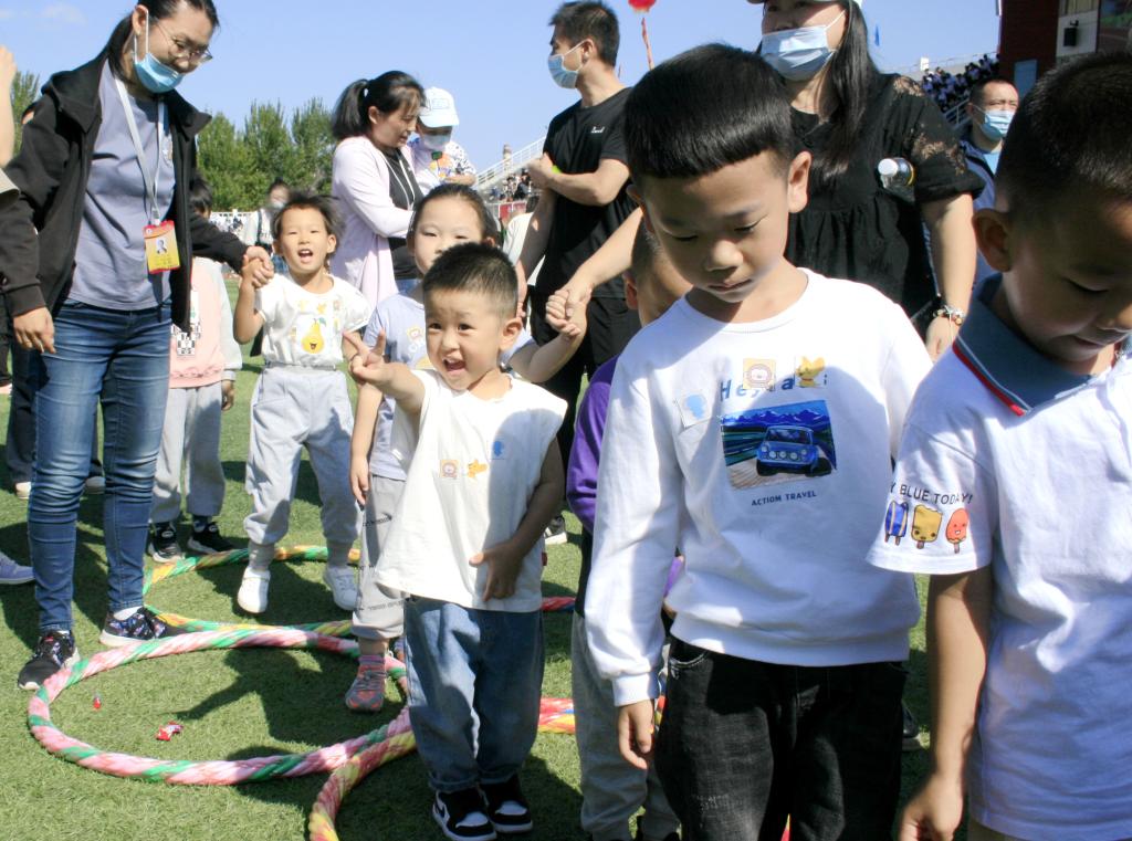 秋风吹叶易湖边,艳阳高照运动场。9月16日,在学校的体育场上彩旗招展,欢声又笑语,2022年秋季田径运动会召开了。特别引人注目的是一支平均年龄4岁近40名的小朋友运动员,他们拉着“教工子弟运动队”的横幅,随着音乐,在家长的陪伴下,大手拉小手欢快地走向运动场中央,参加“比赛”。