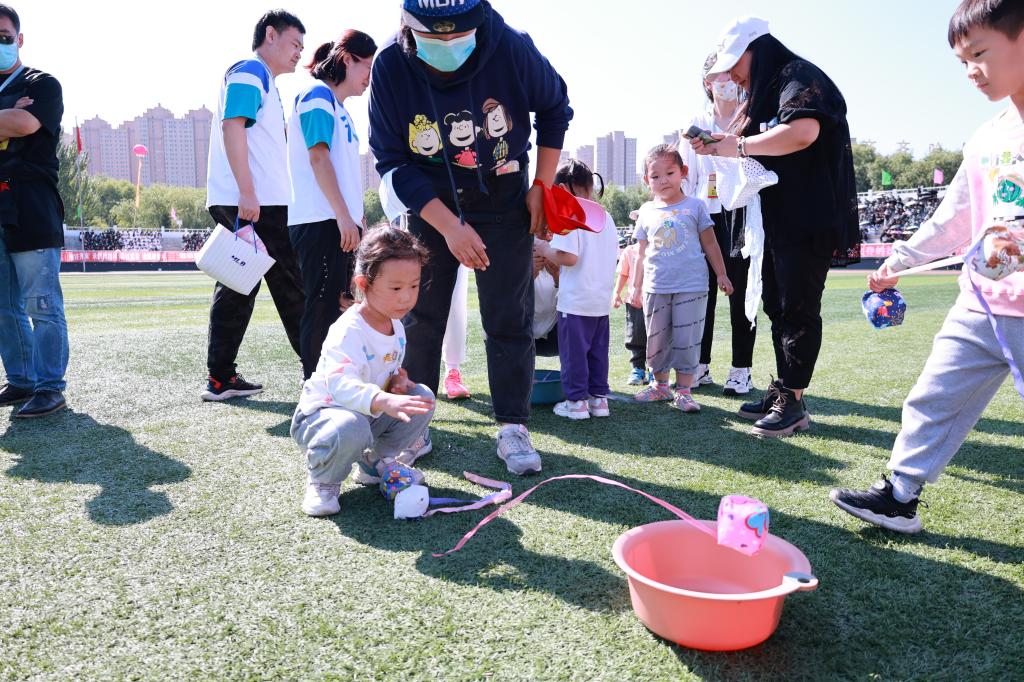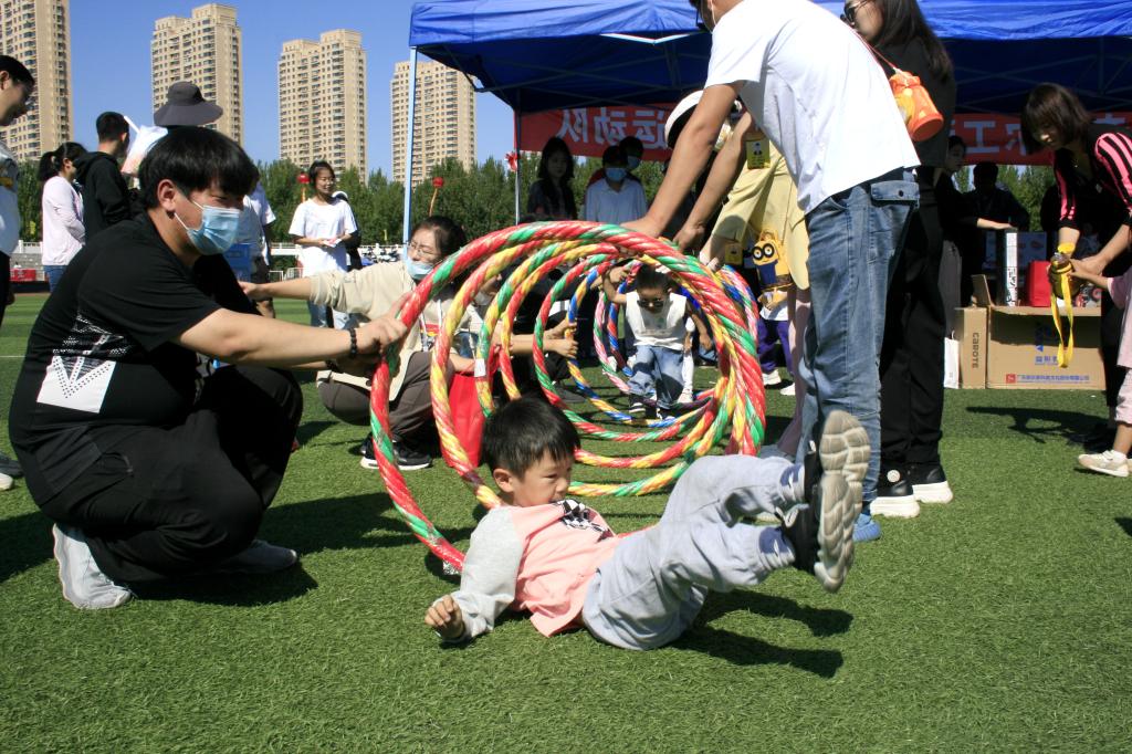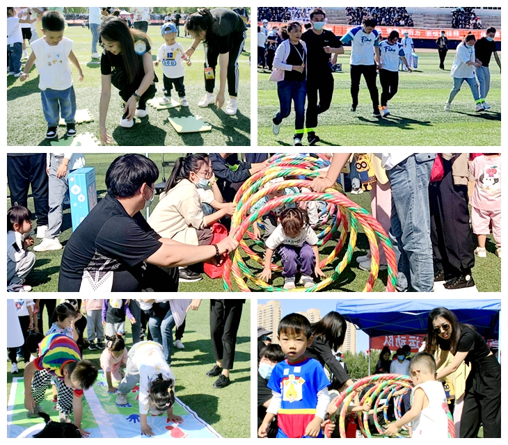 校工会领导和老师们为小运动员们精心设计了欢乐而有趣的“彩虹伞”“手印脚印向前进”“跳跃呼啦圈”“青蛙过河”“投掷沙袋”,以及“两人三足”家庭合作的运动项目。