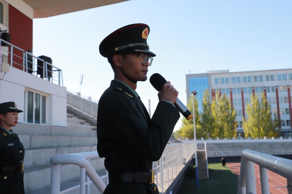 教官团代表王殿旗教官在国旗下演讲。他表示作为青年要勇于担当,做爱国主义的坚守者和传播者,让青春与信仰同行,以实现中华民族伟大复兴为己任,不负时代,不负国家和人民。