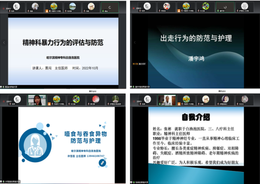 10月25日至28日, 健康与护理系与哈尔滨精神专科白渔泡医院通过腾讯会议云端联合开展精神卫生类知识讲座。哈尔滨精神专科白渔泡医院展闯副院长等八位专家主讲,健康与护理系全体教师参加。讲座旨在更好地开展以学生为中心的教育教学,促使教师加深对精神卫生类知识的认识和应用,在教学过程中及时发现学生的相关问题并利用专业知识进行有效引导,减少行为问题的发生。