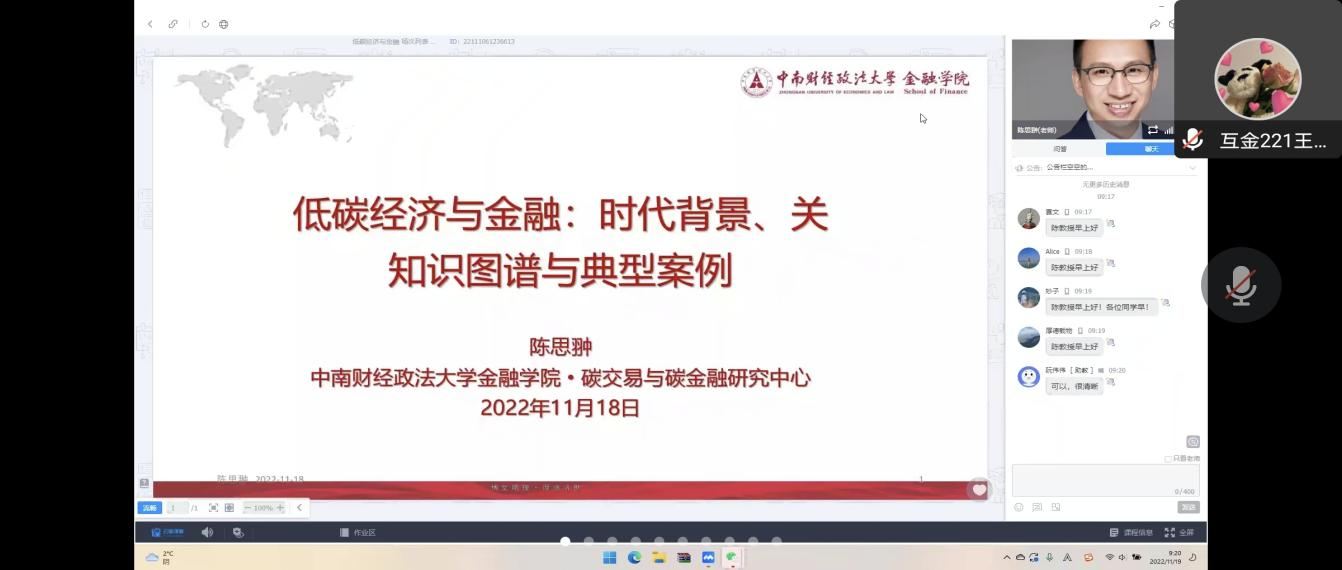 陈教授在论坛上作题为《低碳经济与金融:时代背景、关于知识图谱与典型案例》的专题报告,从时代背景、知识图谱、典型案例三个方面进行具体的阐述与探究,并以碳达峰、碳中和为切入点,分析“双碳”与金融经济之间的关系,其中涉及到了学科交叉,又深入阐述了专业领域和碳经济之间的紧密联系;在知识谱图环节讲解的过程中,让学生了解了气候变化与低碳金融是相互影响的。