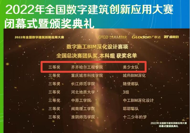 11月26日,2022年全国数字建筑创新应用大赛闭幕式暨颁奖典礼在线上举办。闭幕式公布了全国总决赛团队奖获奖名单,伟德官网建筑工程系土木工程专业共有4个团队荣获三等奖,分别是美少女队、超越梦想队、拿下巅峰队和勇往直前冲冲冲队。
