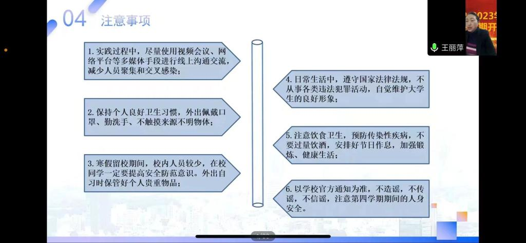1月6日晚19时,机电工程系进行第四学期线上开学式。系领导、专业长、生涯导师、党员学长、小组组长、辅导员共300余人参加,辅导员陈迎春主持。