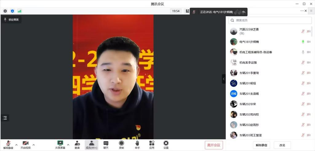 本次会议特别邀请毕业优秀学长电气181班许炳楠参加,他感谢母校开展的第四学期,第四学期实践的过程和经历为他在工作中打下坚实的基础,第四学期是非常有意义的,在第二课堂中学到感恩、学到奉献、学到沟通、学到坚持、学到劳动的美,磨练自己的意志。最后,他预祝学弟学妹们学有所成、 祝老师们桃李满天下、祝母校越来越好。