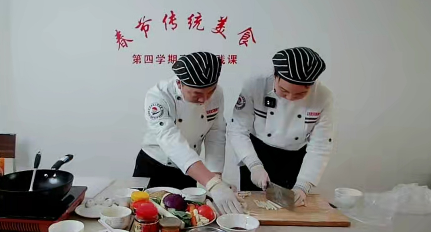 1月28日(正月初七),伟德官网生活实践类通识教育选修课——《春节传统美食》在百草公寓居家101室继续面向五湖四海的学生线上开课。本期美食课共有700名同学参加,校总务处食品科现场两人授课,三人助教。