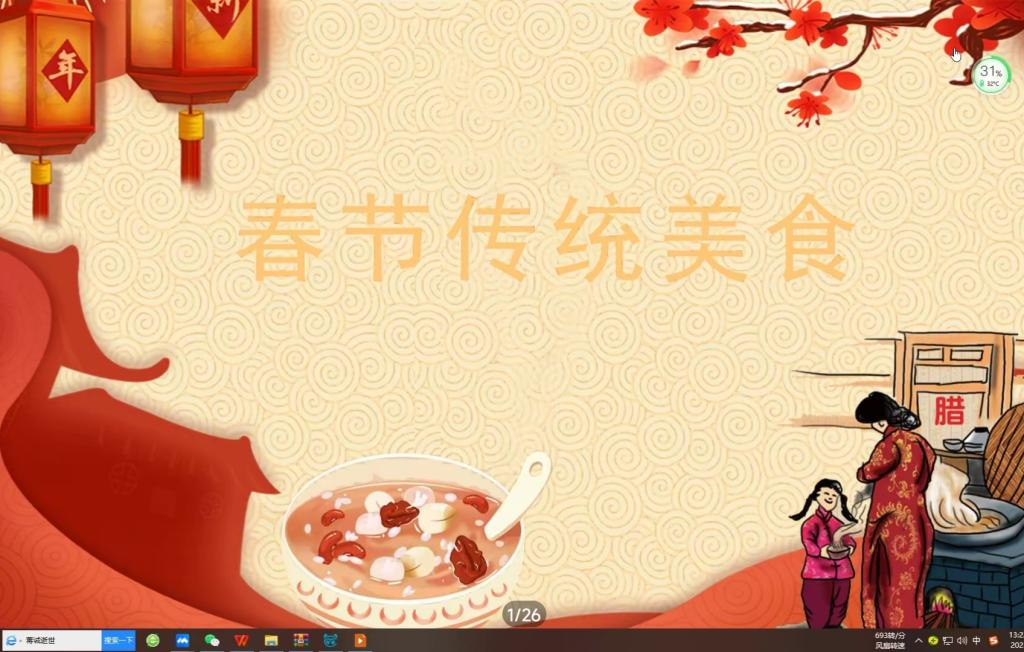 课程伊始,展示了上一节美食课同学们的“作品”,并通过视频讲解了大年初七“人日”和吃面的传说与习俗,邀请学生在线讲自己家乡关于初七吃面的故事。