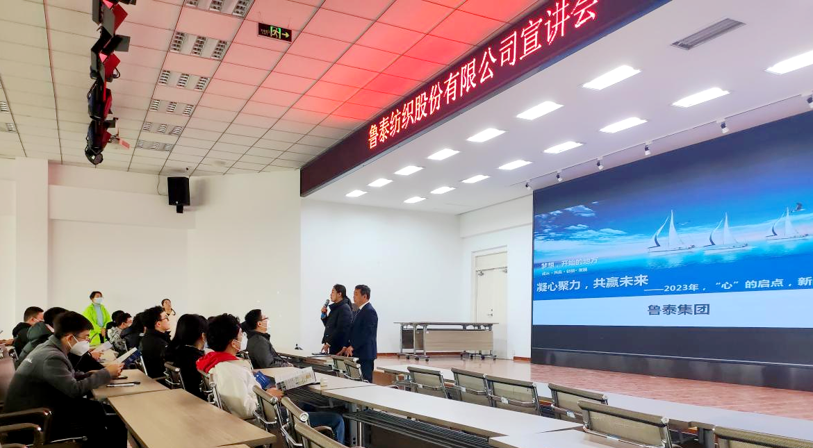 鲁泰纺织股份有限公司一直位居全国纺织行业前列,在企业的宣讲过程中,负责人介绍了公司的概况、理念、人才策略、管理培训及薪酬福利等;同时学生也对岗位和生涯发展提出问题,得到现场解答。
