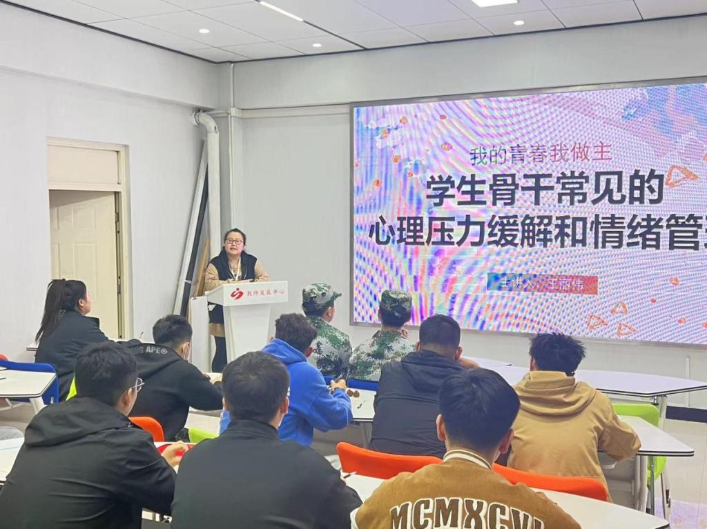 管理工程系团总支书记王丽伟老师以《心理压力缓解和情绪管理》为题进行培训。她提出了身为班长,在学习和工作之余,保持自身的心理健康更是重中之重,并巧妙地插入了几个心理压力的测试题,更直观地体现了解除心理压力的重要性。她认为,心理健康是管理班级的前提,并且在管理班级的同时,情绪的表现也是身为学生骨干所应注意的方面。