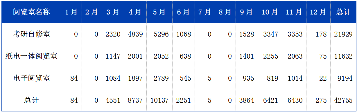 2022年6月和12月学生陆续离校,7、8月和1、2月为学生第三和第四学期。在第一和第二学期内,入馆人数呈现出逐月递增的趋势,5月入馆人数最多,超一万人次。因在校生考研、考证需求较大,特批考研自修室每天延时闭馆两小时,其入馆人数明显高于其他馆室。按疫情防控要求,图书馆严格控制每日入馆人数,并实行“一桌两人,对角入座”要求,入馆人数相对于往年下降较多。