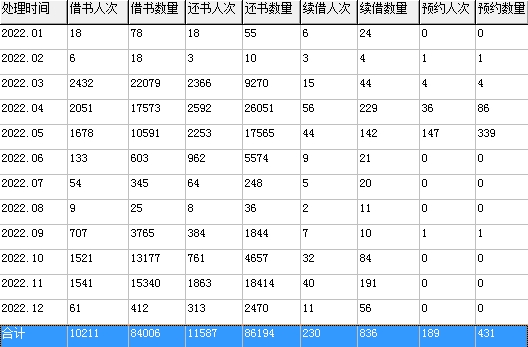 2022年,图书馆充分调研师生实际阅读需求,开通多种资源推荐方式,以需求为导向,优化馆藏资源配置,并在疫情防控常态化的形势下,积极开展线上线下服务,落实服务育人。整体文献资源利用率得以大幅提升,相关数据如下表: