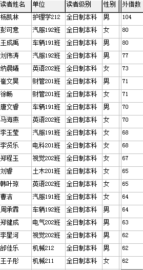 此次列出借阅榜前二十的读者名单,大家齐头并进,相差并不多,已然形成浓厚的阅读学习氛围,且榜单中男女比例趋近1:1,说明阅读行为习惯的性别差异不大,全校师生共同促进了优良的学风建设;护理学212班杨凯林同学以全年借书104本的记录居“阅读之星”榜首;榜单中1/2是20级学生,2021级学生仅有三名入围,因2022级学生和2018级学生仅有半年在校时间,此次榜单中并无2022级与2018级学生,可见大二大三学生是年度借阅榜的坚实力量。
