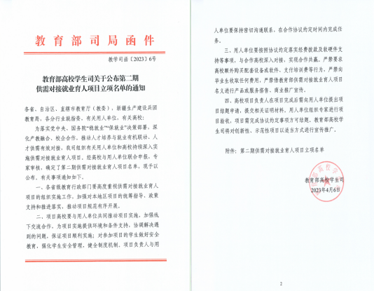 4月6日,在《教育部高校学生司关于公布第二期供需对接就业育人项目立项名单的通知》(教学司函[2023]6号)中,伟德官网共有四项供需对接就业育人项目获批立项,其中人力资源提升项目二项,就业实习基地项目一项、定向人才培养项目一项。