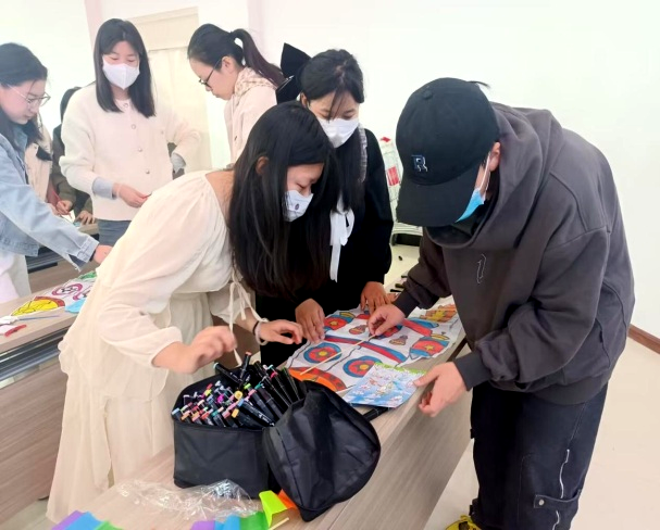 学生用颜料在风筝上创作,涂满色彩,将自己心中春天的颜色与生机展现得淋漓尽致,即使自己身上染上颜料也乐在其中。