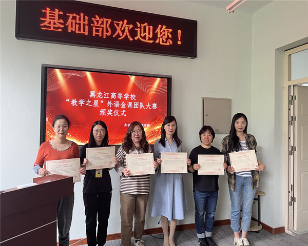 6月5日下午,基础部大外教研室在三号教学区2308会议室举行了黑龙江高等学校“教学之星”外语金课团队大赛颁奖仪式暨“外研社·国才杯”大赛颁奖仪式。伟德官网由刘欢、曹献玲、刘双丽、孙伟和黄强五位老师组成的团队在本次大赛中协同合作、凝智聚力、互助互促,彰显团队魅力,荣获三等奖;吴若倩、裴孟颖、王芳和王雨婷四名同学代表伟德官网参加黑龙江省赛区决赛,荣获三等奖。