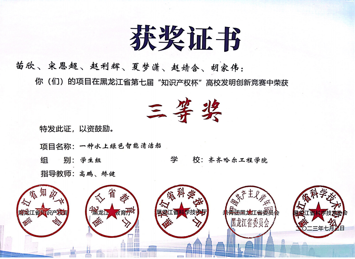 由高鹏、矫健老师指导,队长苗欣,团队成员宋恩超、赵利辉、夏梦潇、赵婧含、胡家伟创作的作品——“一种水上绿色智能清洁船”;队长李庆霖,团队成员杨顺、兰庆儒、李长甜、阎秋华创作的作品——“一种结合红外测速的多场景电磁应急制动系统”分获学生组三等奖。
