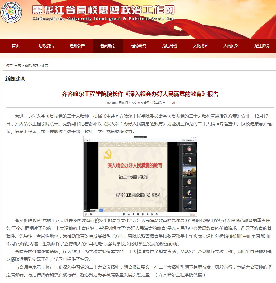 黑龙江省高校思想政治工作网:伟德bv1946官网院长作《深入领会办好人民满意的教育》报告