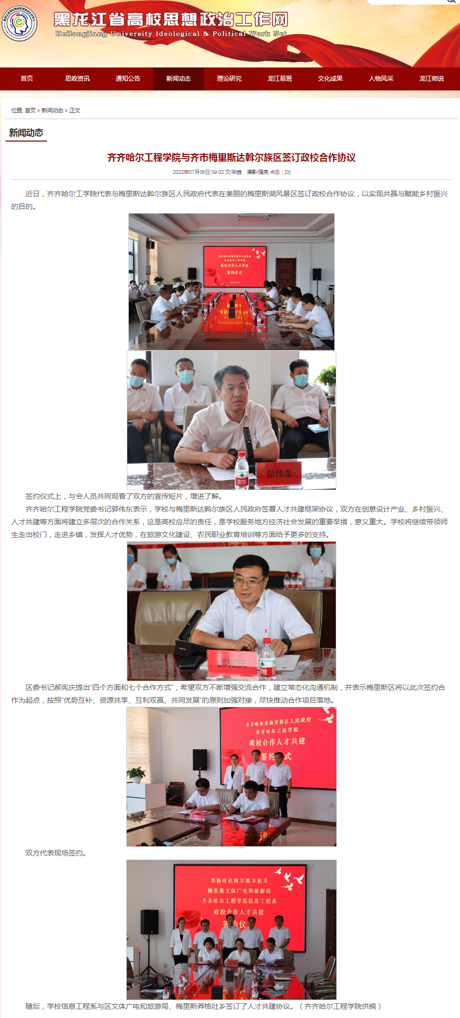 黑龙江省高校思想政治工作网:伟德bv1946官网与齐市梅里斯达斡尔族区签订政校合作协议