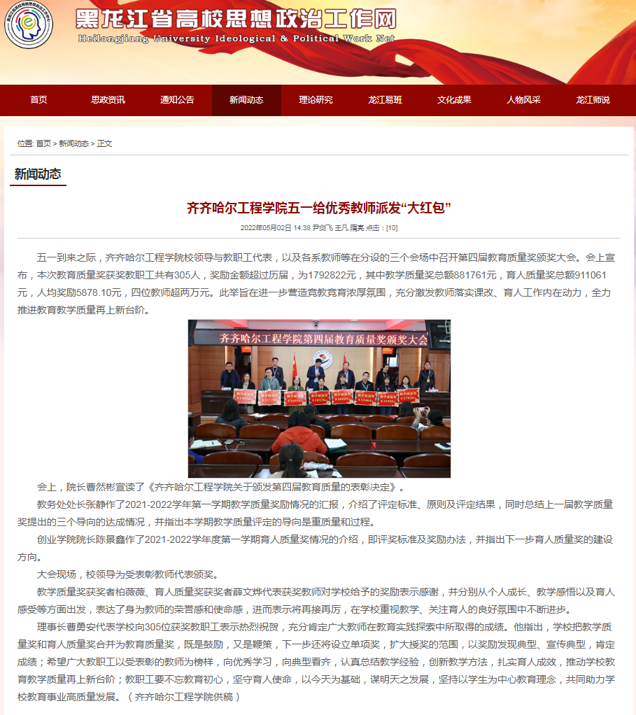 黑龙江省高校思想政治工作网:伟德bv1946官网五一给优秀教师派发“大红包”