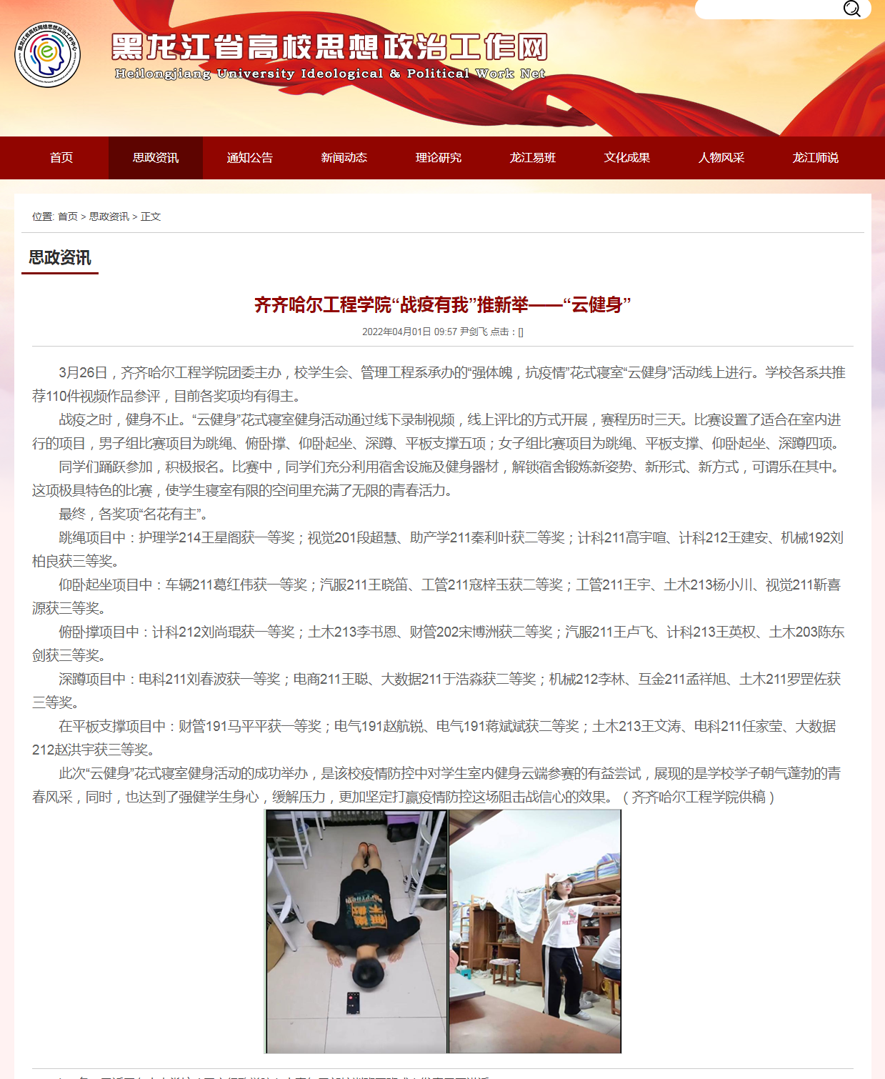 黑龙江省高校思想政治工作网:伟德bv1946官网“战疫有我”推新举——“云健身”