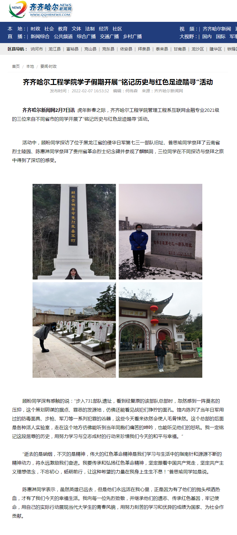 齐齐哈尔新闻网:伟德bv1946官网学子假期开展“铭记历史与红色足迹踏寻”活动