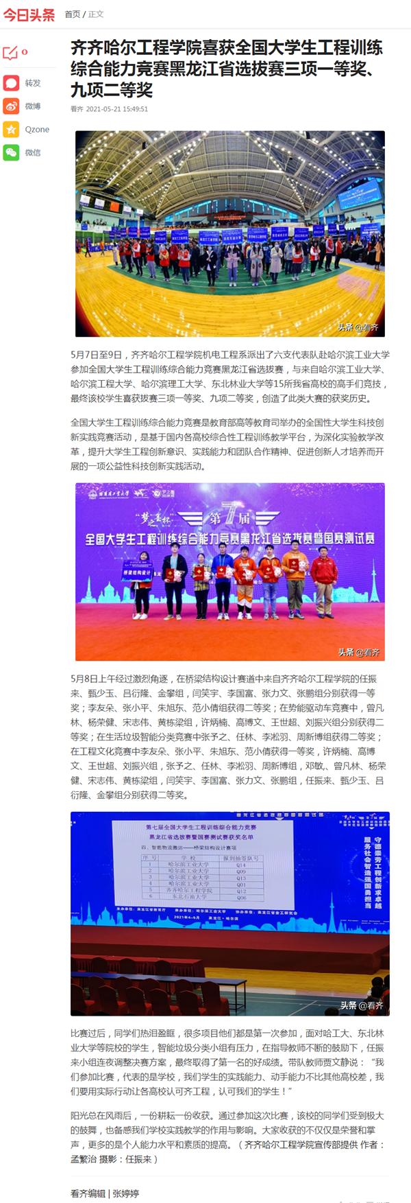 今日头条:伟德bv1946官网喜获全国大学生工程训练综合能力竞赛黑龙江省选拔赛三项一等奖、九项二等奖