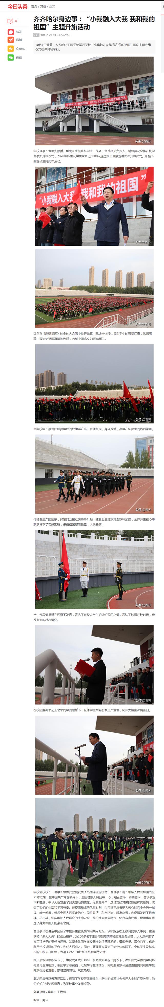 今日头条《齐齐哈尔身边事》:“小我融入大我 我和我的祖国”主题升旗活动