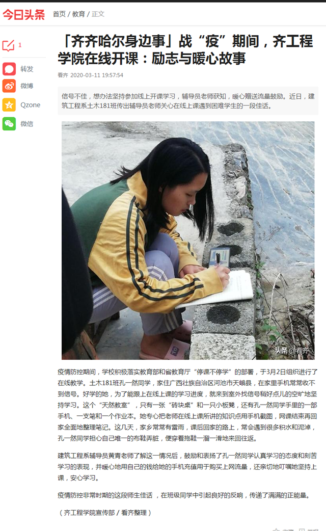今日头条《齐齐哈尔身边事》:战“疫”期间,齐工程学院在线开课的励志与暖心故事