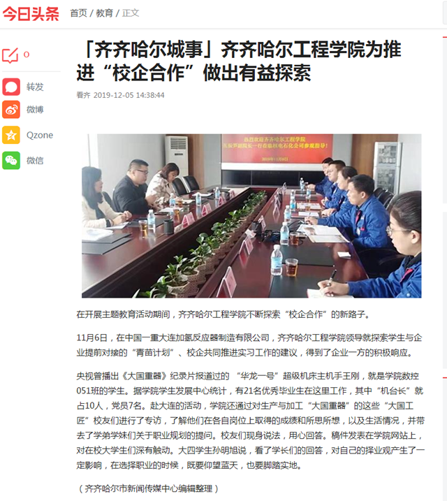 今日头条《齐齐哈尔城事》:伟德bv1946官网为推进“校企合作”做出有益探索