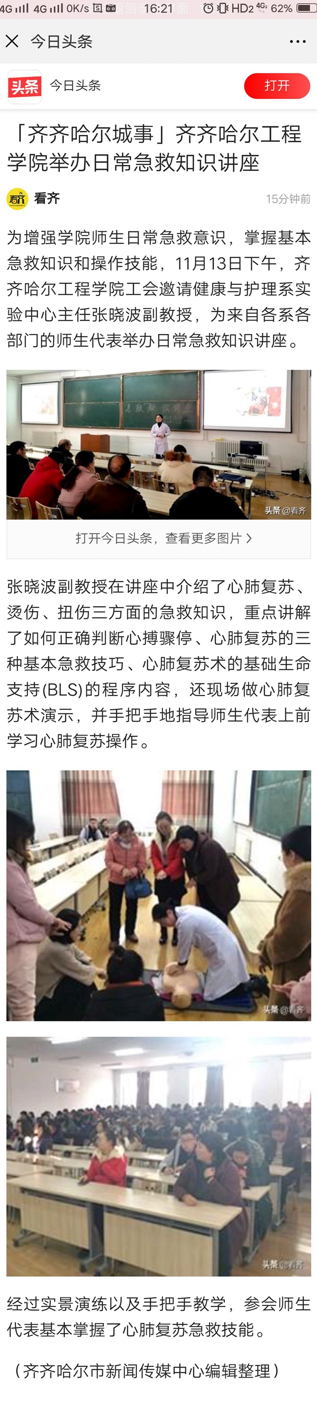 今日头条《齐齐哈尔城事》:伟德bv1946官网举办日常急救知识讲座