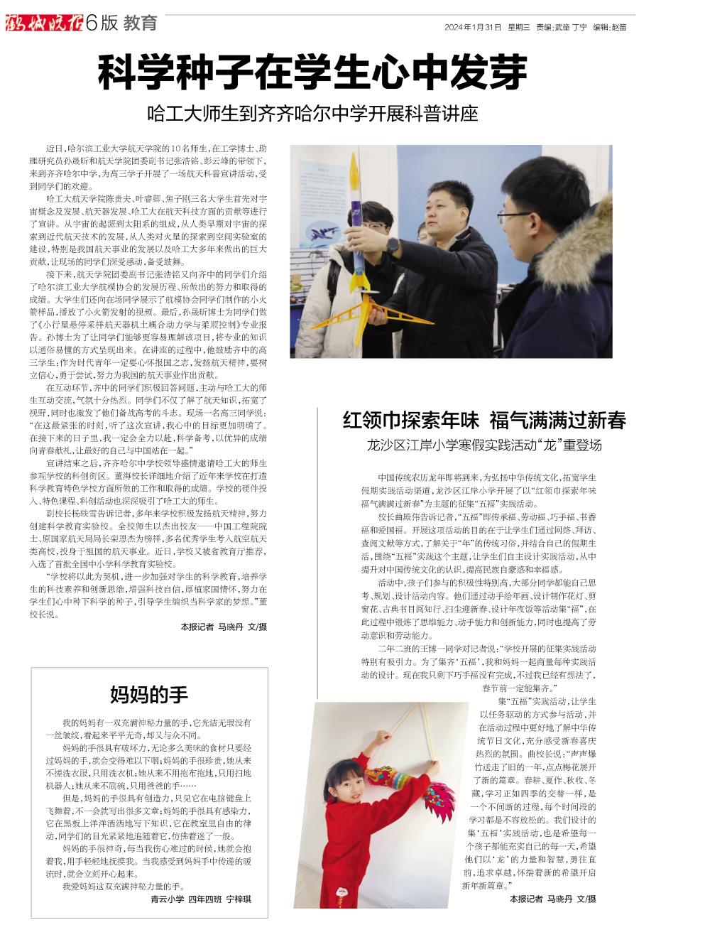 《鹤城晚报》发表子弟学校学生作文《妈妈的手》