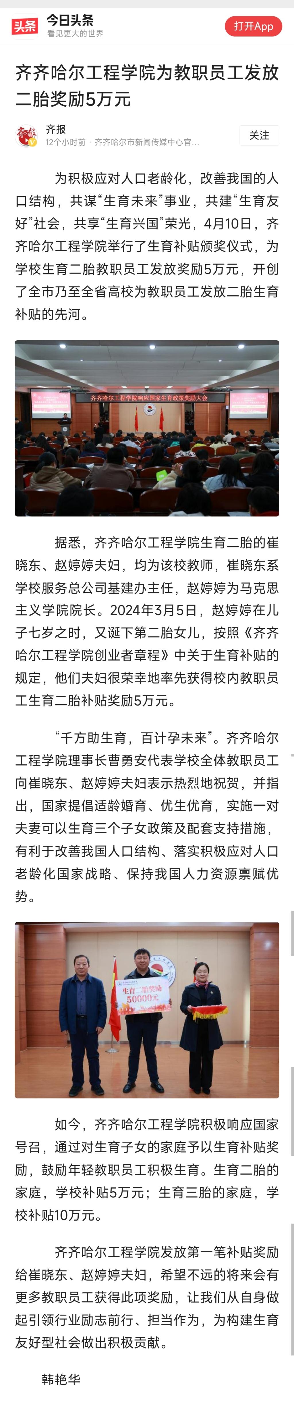 《今日头条》(齐报)报道伟德bv1946官网为教职员工发放二胎奖励5万元