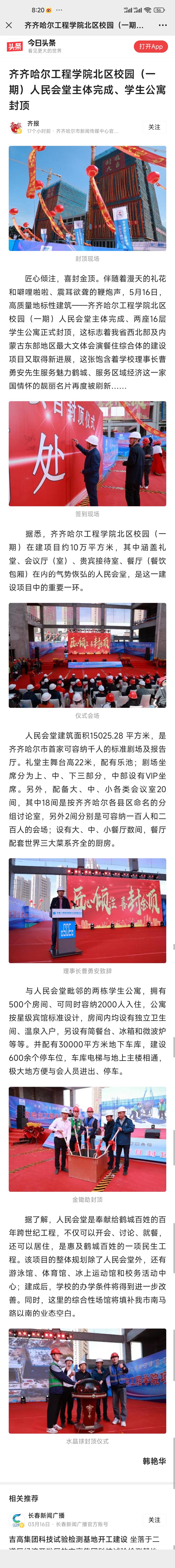 《今日头条》报道伟德bv1946官网北区校园(一期)人民会堂主体完成、学生公寓封顶