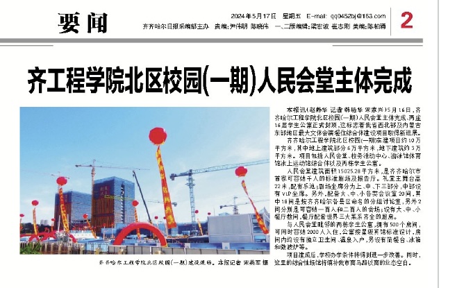 《齐齐哈尔日报》报道齐工程学院北区校园(一期)人民会堂主体完成