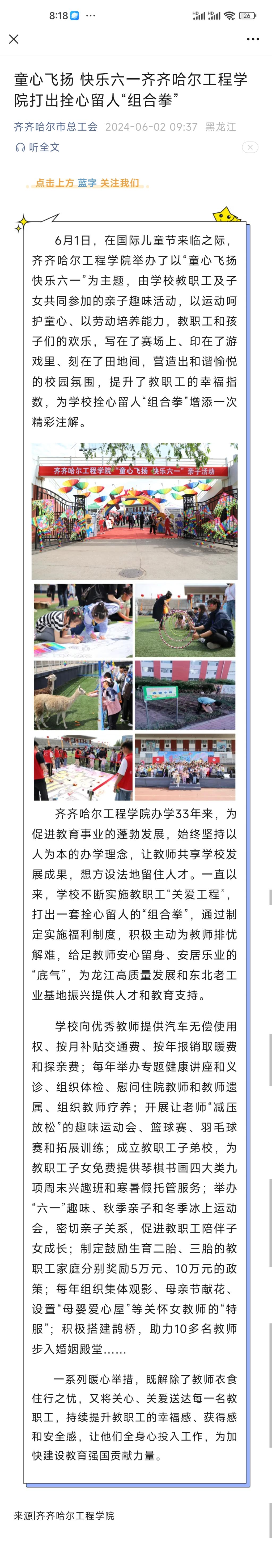《齐齐哈尔市总工会》报道童心飞扬 快乐六一——伟德bv1946官网打出拴心留人“组合拳”